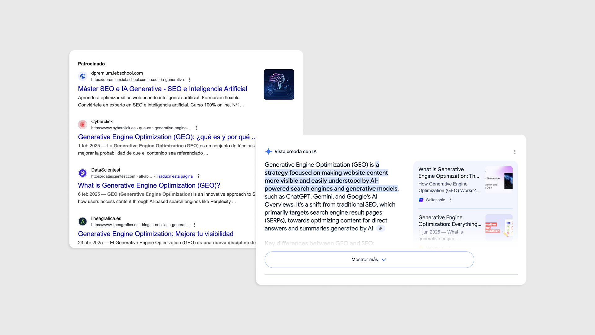 Los motores ya no listan enlaces: responden. Los llamamos motores generativos (sistemas que sintetizan respuestas usando inteligencia artificial) y han cambiado el hábito de búsqueda con SGE (el experimento de Google para respuestas con IA), Bing Chat y ChatGPT. De ahí nace GEO (prácticas para que la IA seleccione tu contenido en sus respuestas), que no sustituye al SEO tradicional, pero sí lo recoloca. La pregunta deja de ser “¿en qué posición estoy?” y pasa a ser “¿me está citando la respuesta?”.
